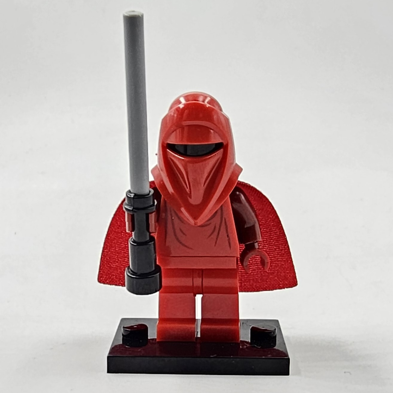 Features the Red Royal Guard’s flowing crimson robes, sleek helmet, and iconic force pike weapon in detailed block-style form.